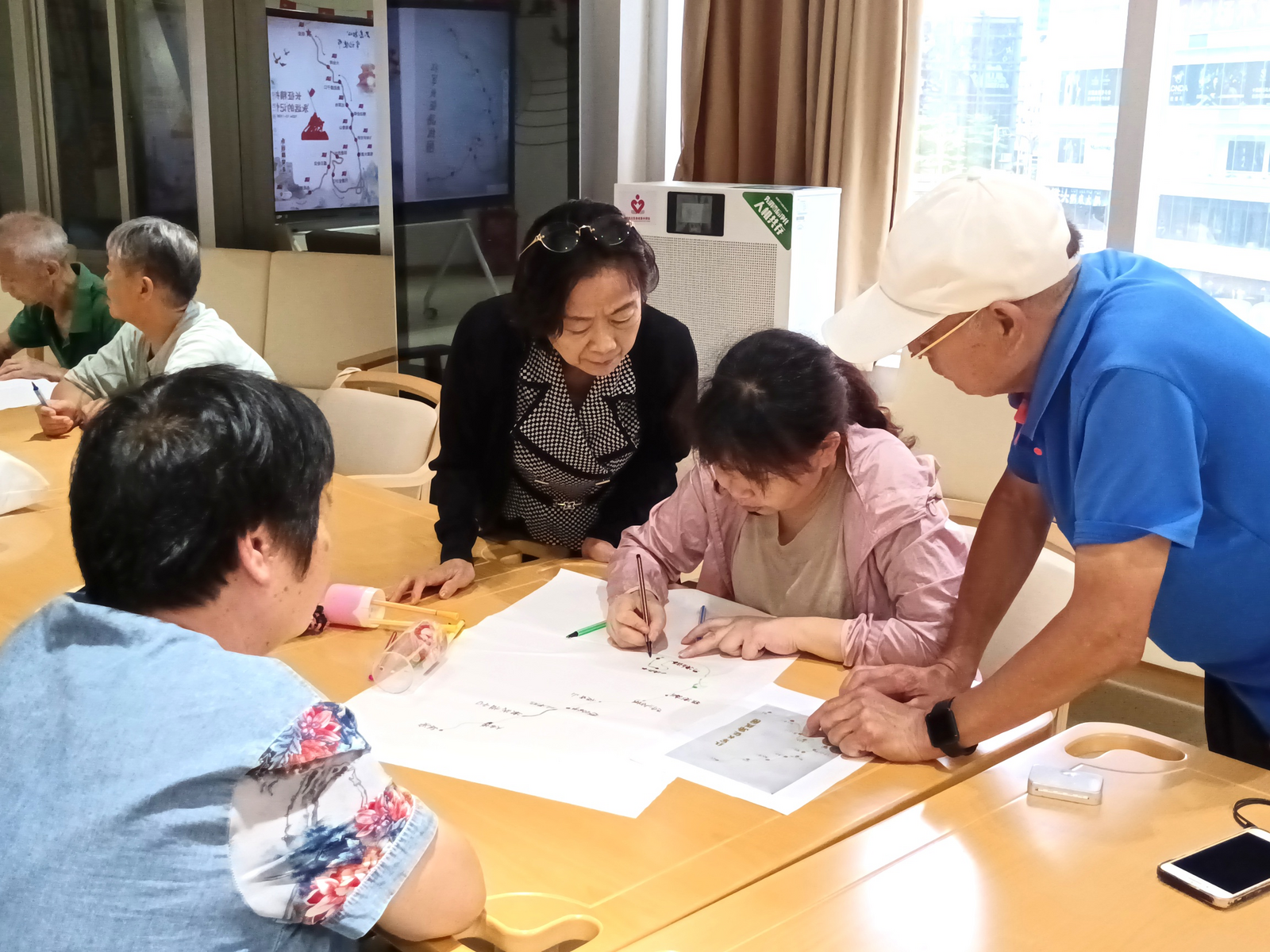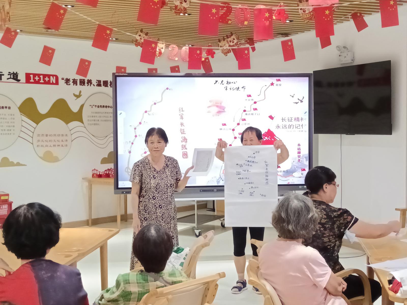 活动伊始,工作人员向长者们讲述了中国共产党辉煌的百年历史,并通过绘制红军长征路线图的游戏,使长者们感受到中国共产党经历了峥嵘岁月才取得了今天的伟大成就。现场长者们分成四个小组共同绘制红军长征路线图,绘制过程中长者积极献言进策共同回顾红军长征经过。各组绘制完成后,长者们挥动手中的红旗,齐声高唱《没有共产党就没有新中国》,嘹亮的歌声充满了对党的感恩之情。最后,工作人员献上精美的生日蛋糕,为七月份生日的长者们戴上了生日帽,伴随着“祝你生日快乐……”的旋律,寿星们共同许下生日愿望,分享这份甜蜜与喜悦。