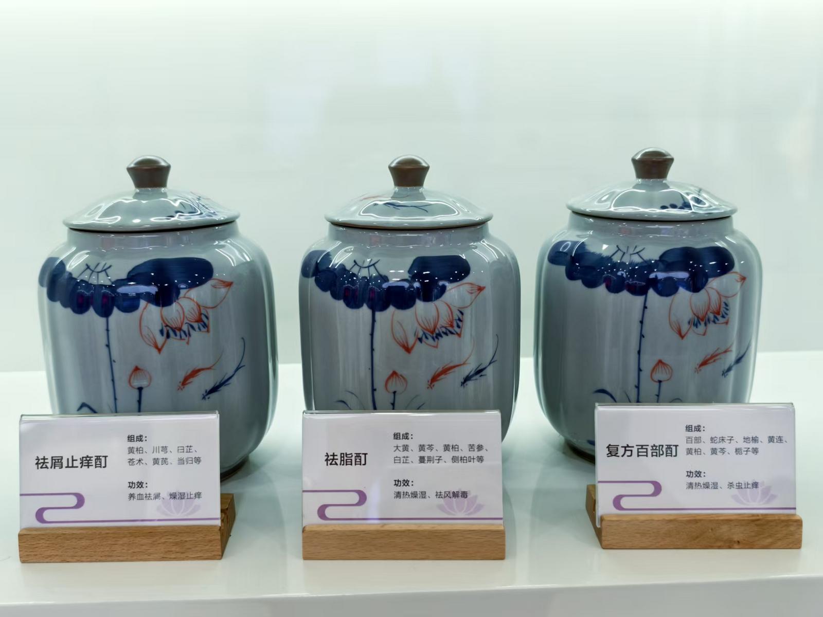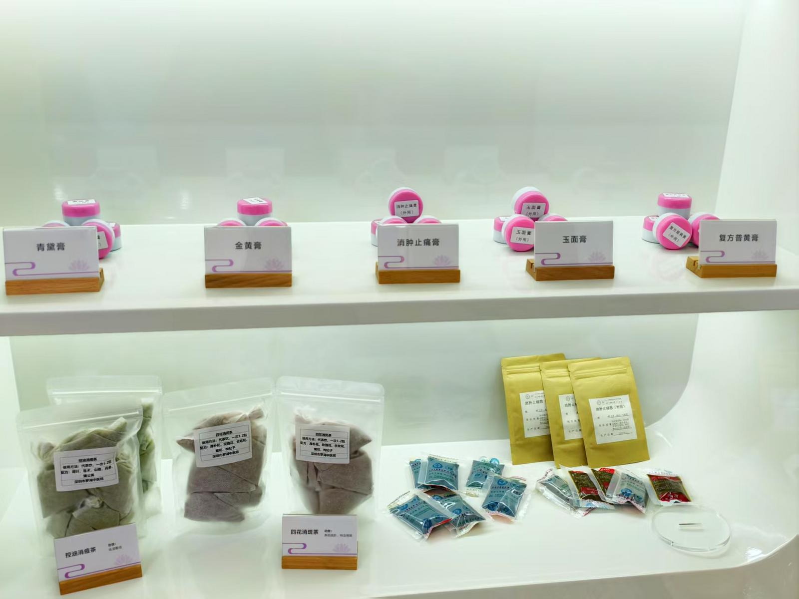 在现场,大厅的一侧摆满了中医治疗药品,包括该院自主开发的痤疮1号、2号,皮炎宁酊,祛屑止痒酊等等。另一侧为患者准备了自配中药控油消痘茶、四花消斑茶等免费饮品。一位香港的女大学生患者告诉说,她是亲友介绍慕名前来求诊的。