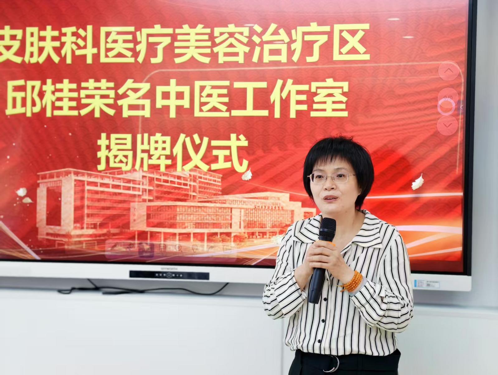 在揭牌仪式上,罗湖区中医院执行院长赵宏,以及来自深圳各大医院的专家学者等嘉宾们先后致辞。他们感慨这个医疗美容最早仅有两个人,现在已经发展为拥有一批科技人员的雄厚中医美容阵容。如今不仅空间扩大,而且治疗水平提升,为深圳首家有中医美容资质的中医美容科。在热烈的掌声中,罗湖中医院党委书记郭春江等拉开红绸揭牌,庆贺配置一新的该院皮肤科美容治疗区正式启用;同时“全国老中医药专家学术经验继承工作指导老师邱桂荣名中医工作室”也正式揭牌。
