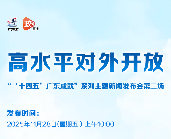广东省人民政府新闻办定于11月28日上午10时召开第二场“‘十四五’广东成就”系列主题新闻发布会,主题为:高水平对外开放。邀请省商务厅主要负责人,海关总署广东分署、人民银行广东省分行负责人介绍“十四五”时期广东推进高水平对外开放情况,并回答记者提问。