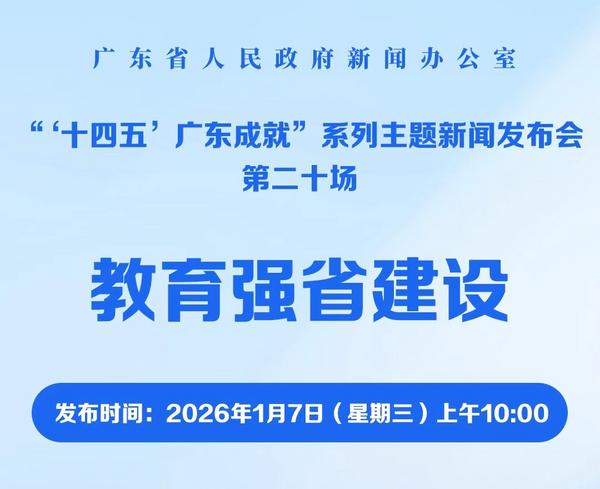 广东省人民政府新闻办公室定于2026年1月7日上午10时在广州市广东大厦三楼国际会议厅召开“‘十四五’广东成就”系列主题新闻发布会,主题为:教育强省建设。邀请省教育厅主要负责人作主发布,省教育厅相关负责人参加,介绍“十四五”时期广东推进教育现代化,建设教育强省等情况和成效,并回答记者提问。