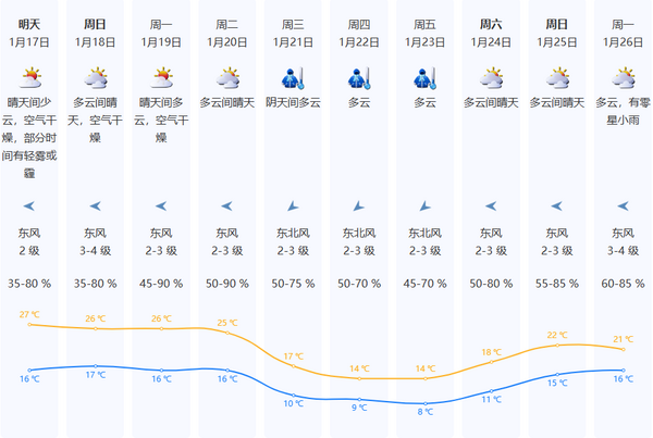 下周三(1月21日)起将有明显降温,暖意退场。