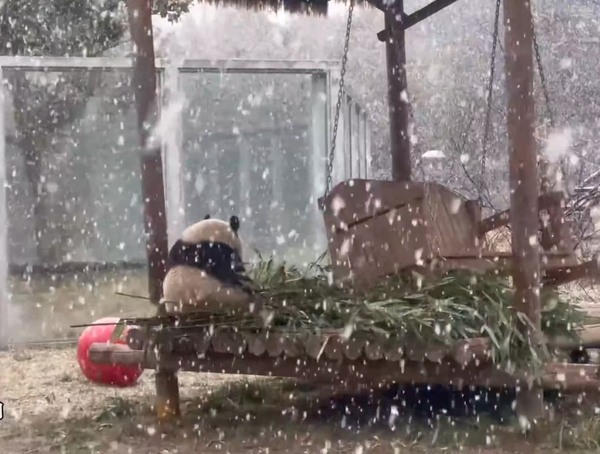 在西安秦岭野生动物园,大熊猫“梦梦”起初还端坐着安安静静地吃竹子,可当它吃饱后,面对漫天大雪,“梦梦”开心地在外场来回跑动。