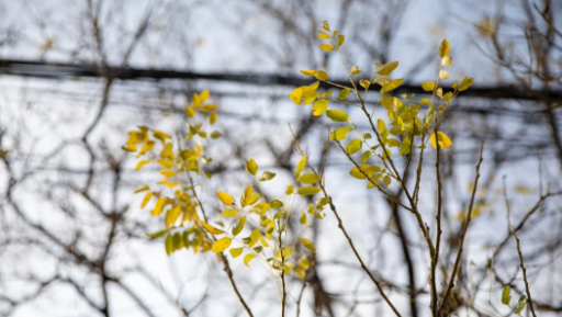 初冬时节,褪去树叶的国槐,向人们展现了斑驳的美。它的树干粗壮,树皮皲裂,枝干交错纵横地生长着,有些已伸到了路边,有些越过了平房的屋顶。仅剩下的稀疏叶片在阳光下泛着黄色,展现着古树的生机。