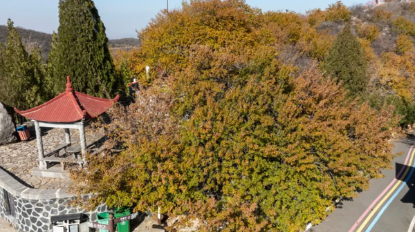 冬日的长寿山仍然存有韵味。登临山顶,三棵古橿树在阳光下泛着金光,枝头系满的红黄丝带随风飘舞,承载着无数人的心愿。