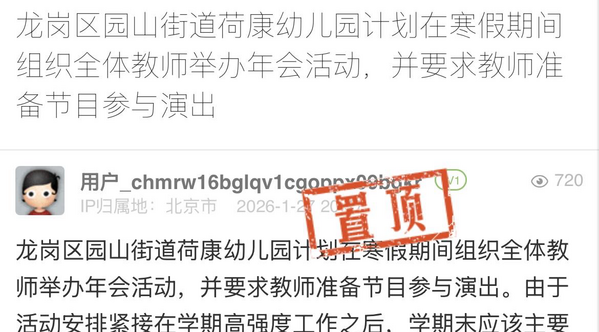 近日,有网友在《问政深圳》平台反映,龙岗区园山街道荷康幼儿园组织全体教师举办年会活动,要求教师准备年会节目,因活动安排紧接在学期高强度工作之后,排练会对教师的正常休息、个人生活及次日工作状态均造成较大影响。