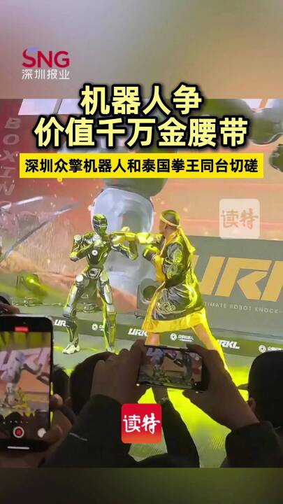 深企机器人对战泰国拳王 燃爆全场! 机器人也来争价值千万金腰带。#深圳众擎机器人 #机器人大战拳王 #首届全球人形机器人自由格斗联赛 (视频/滕琪 实习生 林学臻)