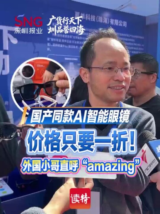 【国产同款AI智能眼镜 价格只要一折!外国小哥直呼“amazing”】1月25日,由广东省工业和信息化厅、深圳市人民政府联合主办的“广货行天下”春季行动消费电子专场促销活动在深圳“中国电子第一街”华强北正式启动。在深圳市德加洲电子厂的摊位上,摊主正在向数名外国友人介绍国产AI智能眼镜。在国外要3000多价格的产品,在国内只要一折就可以买到,还增加了同声传译的功能,外国小哥直呼“amazing”。产