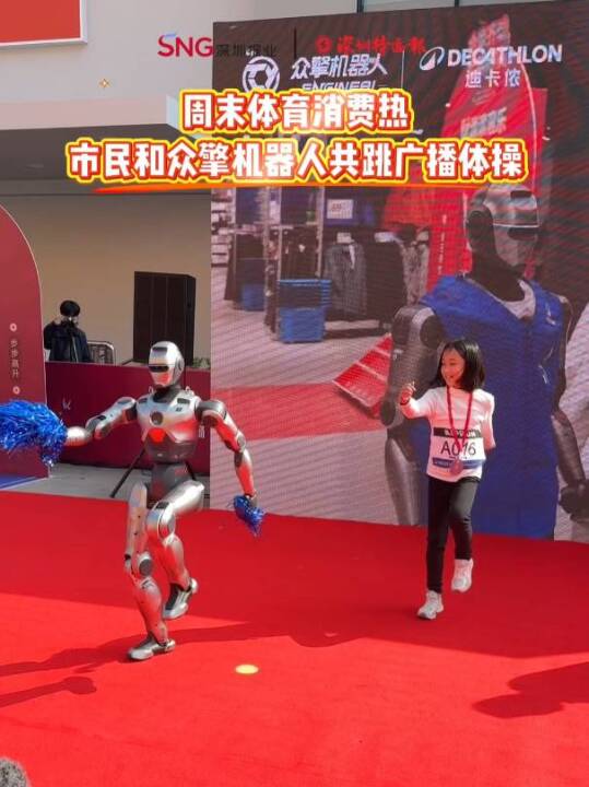 1月24日,在迪卡侬深圳20周年庆现场,市民和众擎机器人共跳广播体操,掀起体育运动、体育消费热潮。(深圳特区报&读特记者 苗威 吴亚男/视频)