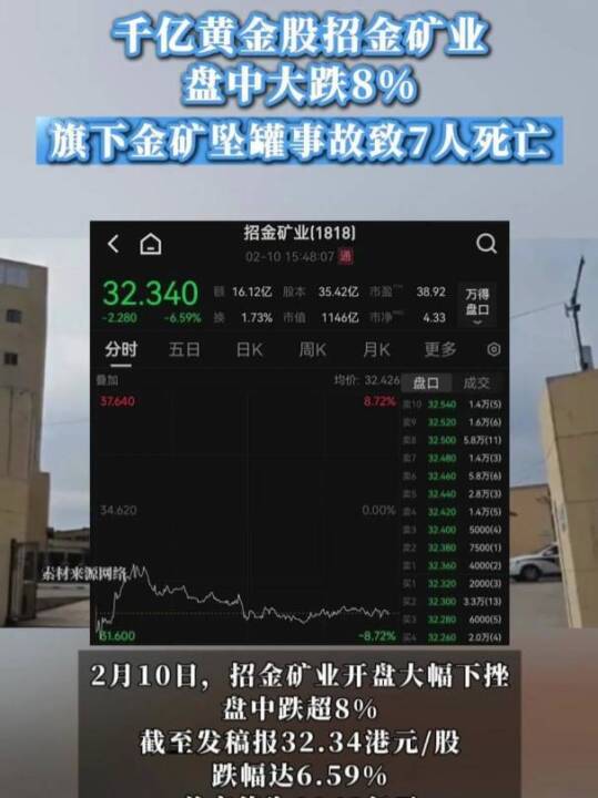 千亿黄金股招金矿业盘中大跌8%,旗下金矿坠罐事故致7人死亡。#招金矿业 #蚕庄金矿
