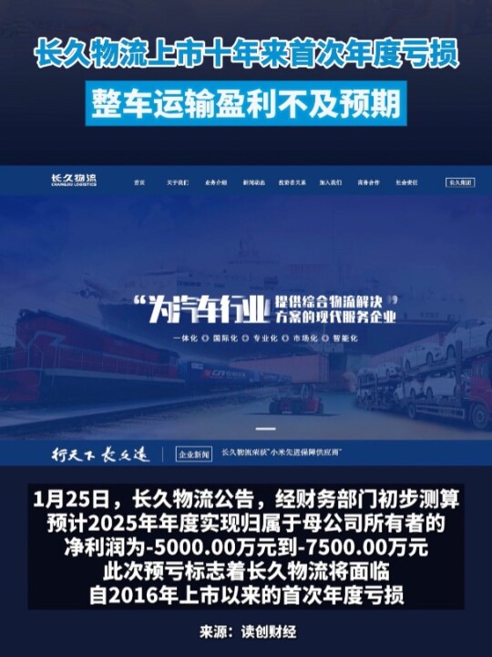 上市十年首度预亏!长久物流2025年预计净亏损最高7500万元。#长久物流 #整车运输