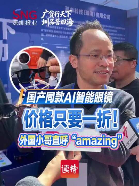 【国产同款AI智能眼镜 价格只要一折!外国小哥直呼“amazing”】1月25日,由广东省工业和信息化厅、深圳市人民政府联合主办的“广货行天下”春季行动消费电子专场促销活动在深圳“中国电子第一街”华强北正式启动。在深圳市德加洲电子厂的摊位上,摊主正在向数名外国友人介绍国产AI智能眼镜。在国外要3000多价格的产品,在国内只要一折就可以买到,还增加了同声传译的功能,外国小哥直呼“amazing”。产