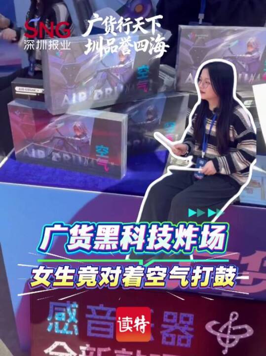 广货黑科技炸场 女生竟对着空气打鼓在“广货行天下”春季行动现场摊位,小姐姐对着空气抬手敲打,清脆的架子鼓鼓点便实时响起,无实体器械却能实现沉浸式演奏,科技感拉满。(深圳报业集团记者 王睿 黄卓坚 剪辑 庄莉芝)