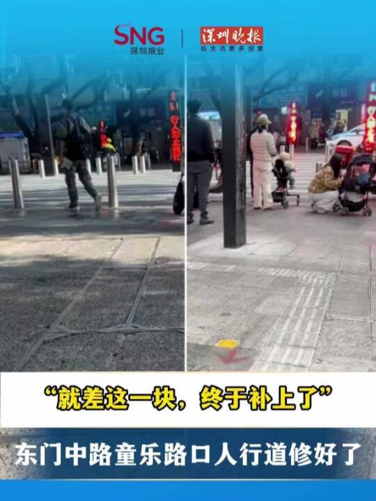 “就差这一块,终于补上了”东门中路童乐路口人行道修好了(深圳报业集团记者 雷海燕 谭钧仁/剪辑)