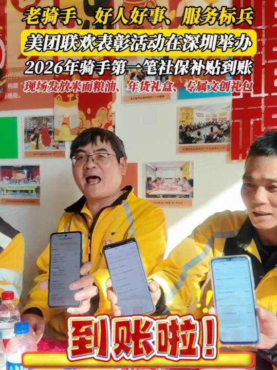 【好人好事、“安全之星”、十年老骑手领奖受表彰,#深圳骑手联欢现场领米面粮油年货#】“年货礼盒收到了,手机短信提醒新年第一笔社保补贴也到账了!”2月5日,骑手在深圳联欢活动现场领到米面粮油和骑手年货礼包,晒出手机到账页面。在活动现场,骑手们一同捏面人、吃糖葫芦,现场还设置了幸运抽奖、非遗面塑体验、互动K歌等环节,年味十足,欢声笑语不断。据悉,春节前,美团在全国各站点、骑手之家举办新春联欢,近10万