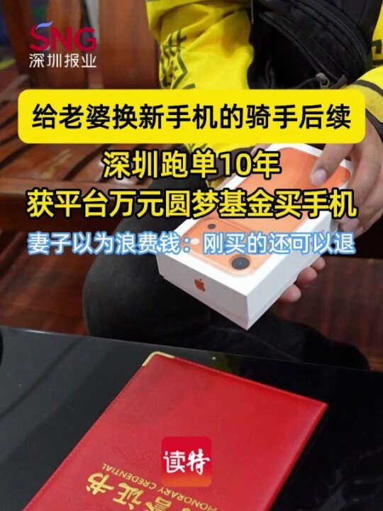 近日,在广东深圳,一名骑手收获了平台发放的万元圆梦基金,拿到基金后,他第一时间就赶往手机店,为妻子更换新手机。而妻子得知手机的购置情况后,心疼丈夫工作不易,当即反复劝说骑手将手机退货,直到了解到这部手机是用平台圆梦基金购买,才收下了这份心意。(读特记者 黄泽霖)#骑手给妻子换手机被反复要求退货 #骑手年味别样浓