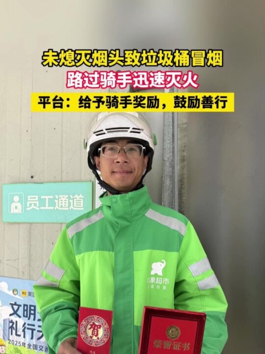 未熄灭烟头致垃圾桶冒烟 路过骑手迅速灭火平台:给予骑手奖励,鼓励善行近日,深圳坂田云上公园,一个垃圾桶因乱扔的烟头冒烟,送餐经过此地的两位骑手立即停车查看。其中,小象超市骑手刘强用自带的饮料灭火,最终,现场没有造成公共财产损伤。事后,小象超市找到了该名骑手,给予了现金奖励和内部表彰。