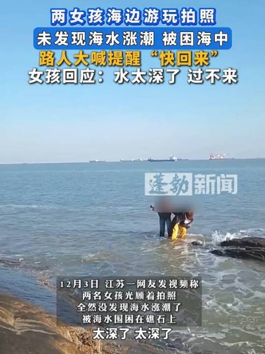 两女孩海边游玩拍照,没发现海水涨潮被困海中!路人大喊提醒“快过来”,女孩回应:水太深了,过不来(直播海南)