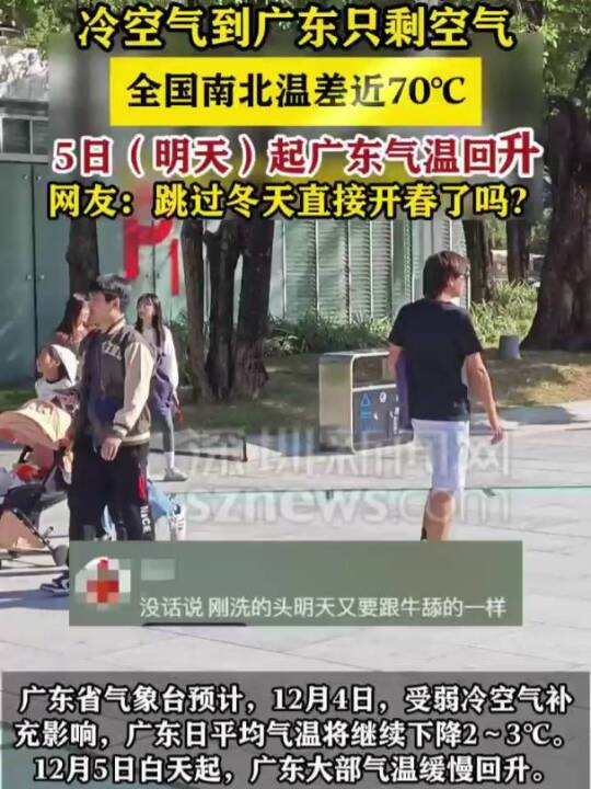 【冷空气到广东只剩空气 全国南北温差近70℃】制作 黎昭欣 审核 何畅 吴沁彤 郑创彬来源 广东广播电视台画面来源网络侵删