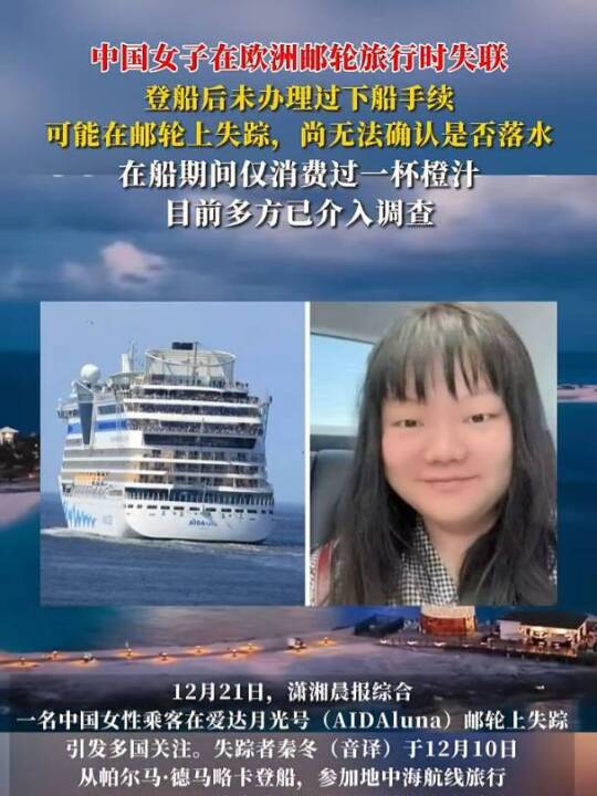 #一中国女性在欧洲邮轮上失联 ,登船后未办理过下船手续,可能在邮轮上失踪,尚无法确认是否落水(潇湘晨报)