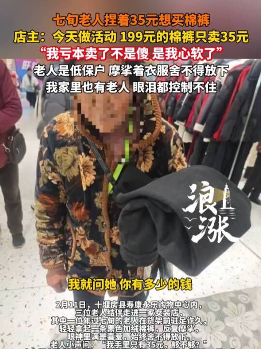 七旬老人捏着35元想买棉裤,店主:今天做活动,199元的棉裤只卖35元。“我亏本卖了不是傻 是我心软了!”(青岛新闻网)