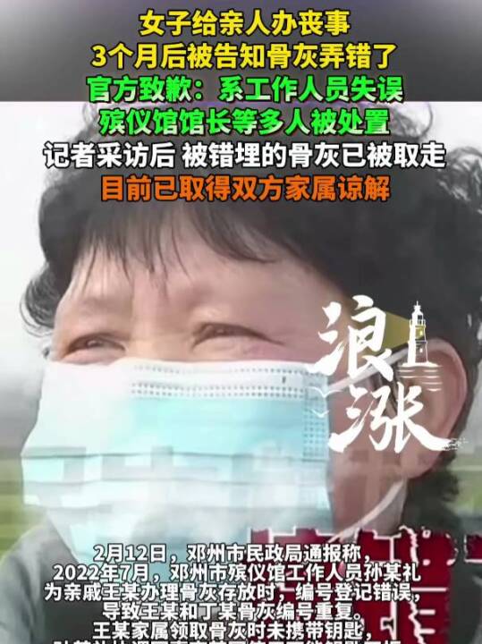 女子给亲人办丧事,3个月后被告知骨灰弄错了,官方致歉:系工作人员失误,殡仪馆馆长等多人被处置。(青岛新闻网)