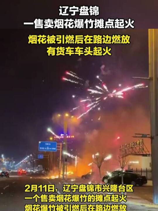辽宁盘锦#一售卖烟花爆竹摊点起火 ,烟花被引燃后在路边燃放,有货车车头起火(新京报)