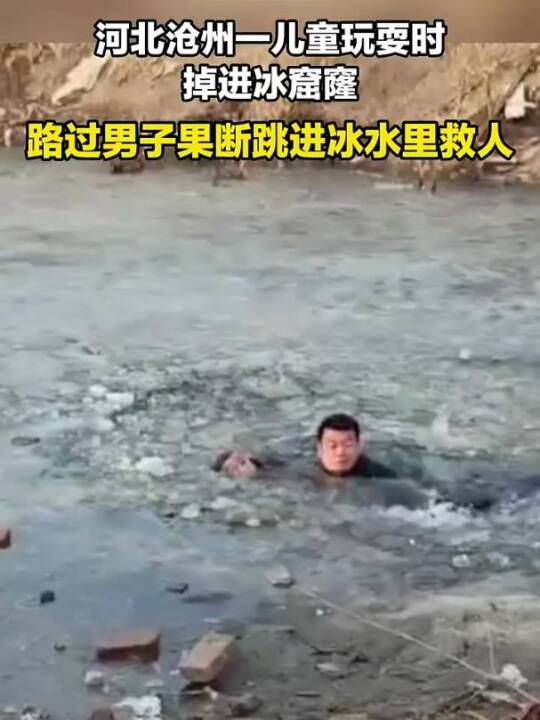 河北沧州#一儿童玩耍时掉进冰窟窿 ,路过男子果断跳进冰水里救人(新京报)