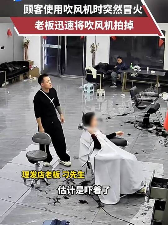 #顾客使用吹风机时突然冒火 ,老板迅速将吹风机拍掉:顾客被吓到了,没受伤(都市频道)