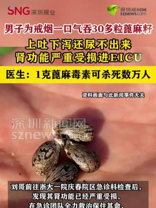 【男子为戒烟一口气吞30多粒蓖麻籽进EICU】(制作:何润 审核:何畅、吴沁彤、郑创彬)