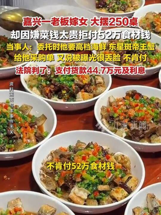 浙江#嘉兴老板嫁女摆250桌宴席拒付菜款 ,法院判了:支付货款44.7万元及利息。(九派新闻、嘉兴电视台)#250桌婚宴52万嫌贵拒付款 #男子拒付52万婚宴食材款案判了
