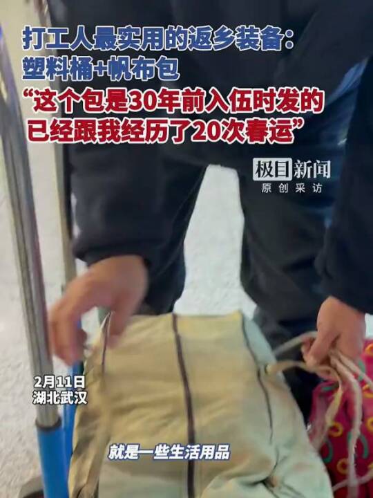 打工人最实用的返乡装备:塑料桶+帆布包。“这个包是30年前入伍时发的,已经跟我经历了20次春运”(极目新闻)