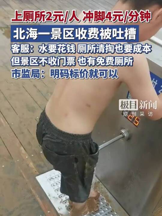 上厕所2元/人,冲脚4元/分钟,#北海一景区收费被吐槽 ,客服:水要花钱,厕所清掏也要成本;市监局:明码标价就可以(极目新闻)