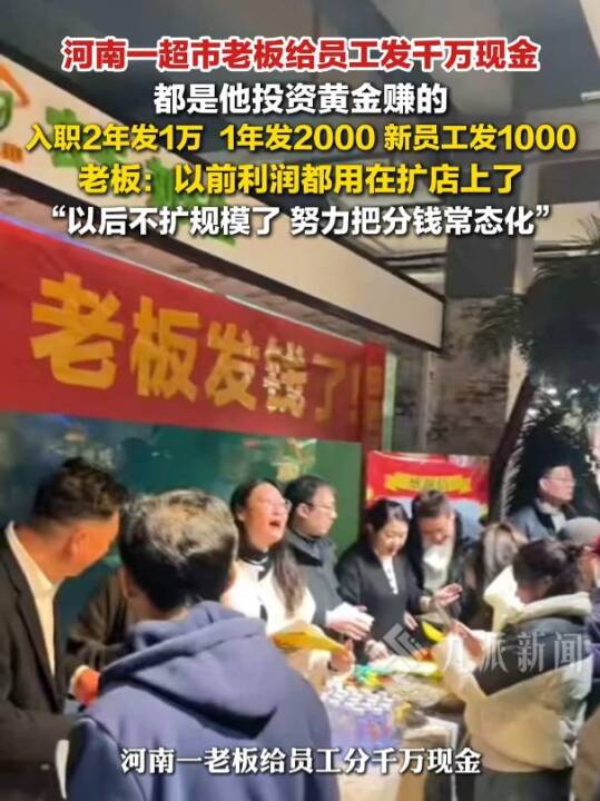 超市#老板投资黄金赚千万全分给员工:入职2年发1万,一年发2000元,新员工发1000元。(九派新闻)