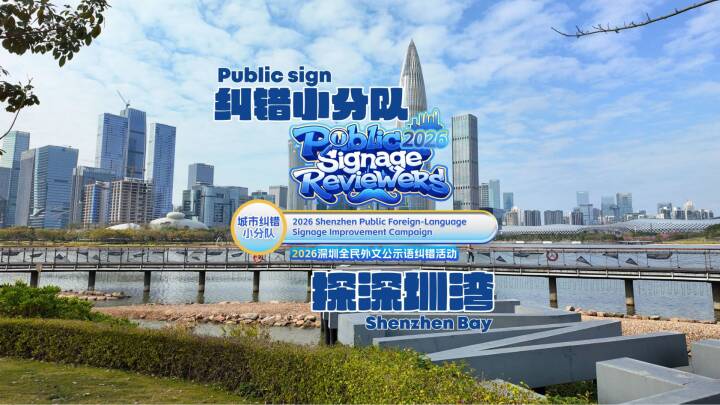 “纠错小分队”探深圳湾 | 2026深圳全民外文公示语纠错活动第二场线下挑战赛于2月12日举行,本次活动中澳大利亚、英国及中国居民组成10人“纠错小分队”,来到南山后海片区,实地走访深圳湾口岸、深圳湾文化广场及深圳湾万象城等地,排查英文公示语标识翻译错误及缺失问题,并给予修改意见。The 2026 Shenzhen Public Foreign-Language Signage Improvem