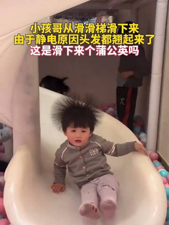 小孩哥从滑梯滑下 由于静电原因头发都翘起来了 网友:这是滑下来个蒲公英吗?(新华社)