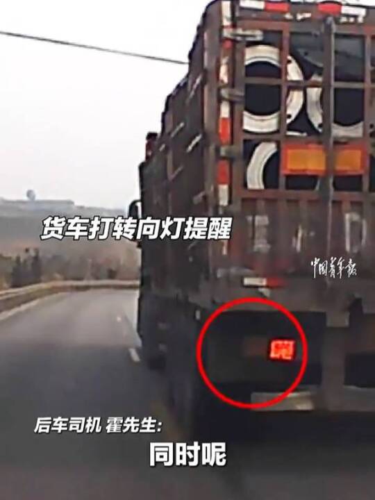 这操作太专业了!货车司机用转向灯提醒后车对向有车,随后又在直道上提醒后车可超车。(新华社、中国青年报)