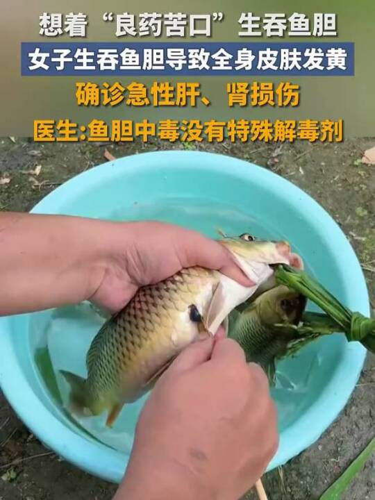 想着“良药苦口”,女子生吞鱼胆导致全身皮肤发黄,确诊急性肝、肾损伤。医生:鱼胆中毒没有特殊解毒剂。(荆楚网、都市现场、现代快报)