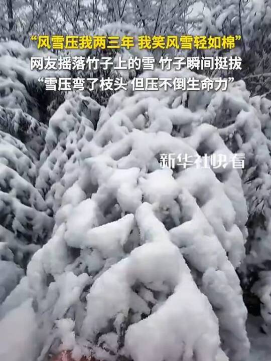 “风雪压我两三年,我笑风雪轻如棉”,网友摇落竹子上的雪,竹子瞬间挺拔,“雪压弯了枝头,但压不倒生命力”(新华社)