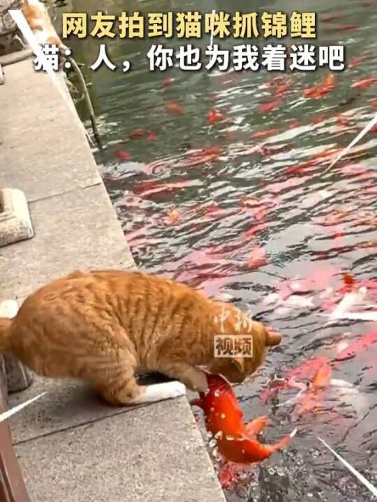 猫咪在公园抓锦鲤引得阵阵尖叫 猫:人 你也为我着迷吧(中国新闻社)