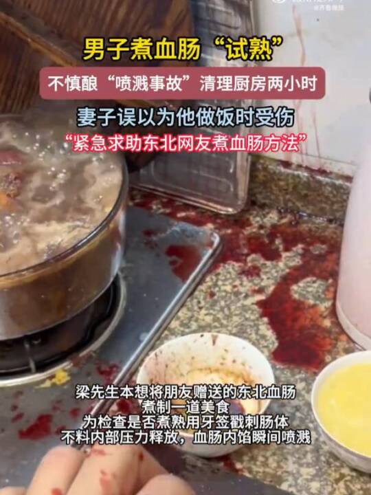 #男子煮血肠刺破肠衣厨房一片狼藉 【男子煮血肠试熟酿厨房喷溅事故】(来源:齐鲁晚报)