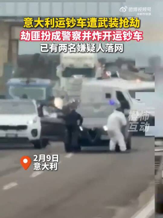 #意大利抢劫运钞车案已有嫌犯被捕 当地时间2月9日上午,意大利一支武装团伙在意大利南部SS613高速公路上袭击了一辆押运现金的装甲车。目前至少两名嫌疑人被捕,没有人员伤亡。(来源:都市快报)