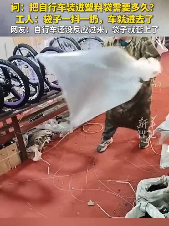 问:把自行车装进塑料袋需要多久?工人:袋子一抖一扔,车就进去了。网友:自行车还没反应过来,袋子就套上了。(新华社)