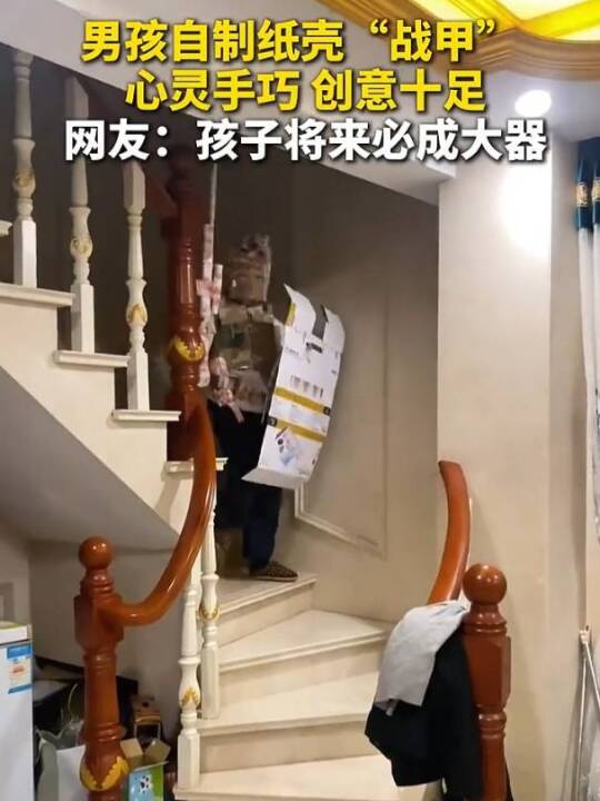 网友分享孩子用纸壳自制“战甲”,装备齐全,造型威风。(新华社)网友分享孩子用纸壳自制“战甲”,装备齐全,造型威风。(新华社)