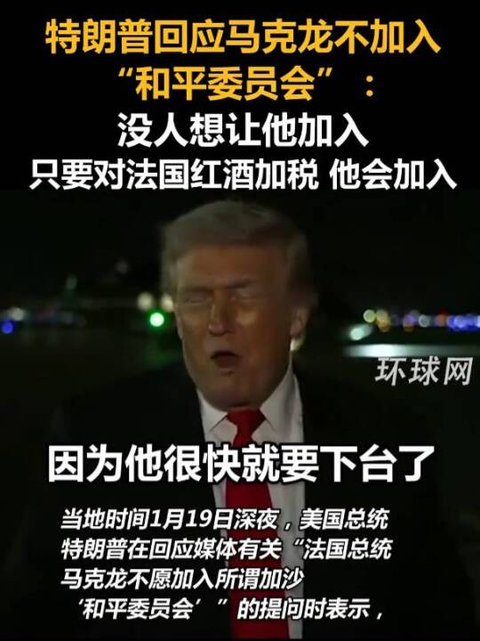 特朗普回应马克龙不加入“和平委员会”:没人想让他加入,只要对法国红酒加税,他会加入(环球网、CCTV国际时讯)