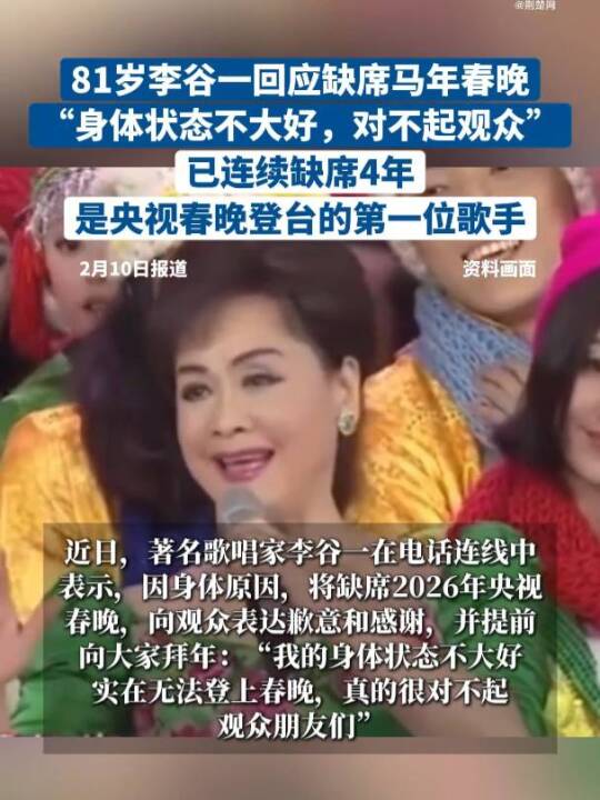 【#李谷一确认缺席2026年央视春晚 ,“身体状态不大好”,1984年起她的《难忘今宵》成春晚固定压轴歌曲,2023年缺席至今】(来源:荆楚网)