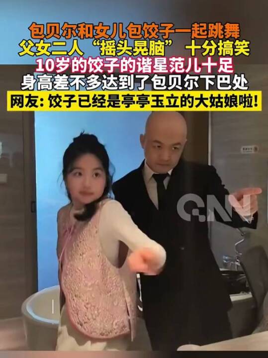 包贝尔和女儿包饺子一起跳舞,父女二人“摇头晃脑” 十分搞笑,10岁的饺子的谐星范儿十足,身高差不多达到了包贝尔下巴处(青岛新闻网、中国蓝新闻)
