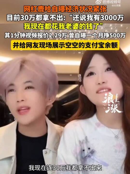 网红鹿哈自曝现在都是花老婆的钱(浪涨新闻、大河报)