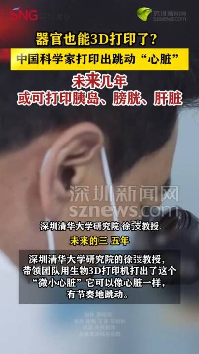 【中国科学家打印出跳动的心脏类器官】器官也能3D打印了?中国科学家打印出跳动“心脏”未来几年或可打印胰岛、膀胱、肝脏深圳清华大学研究院的徐弢教授,带领团队用生物3D打印机打出了这个“微小心脏”它可以像心脏一样,有节奏地跳动。徐弢介绍,未来三五年,有望实现3D打印胰岛、膀胱等相对简单的器官;肝衰早期患者或可用上3D打印的“微型肝脏”,进行器官的局部修复。(央视新闻)制作 黎昭欣