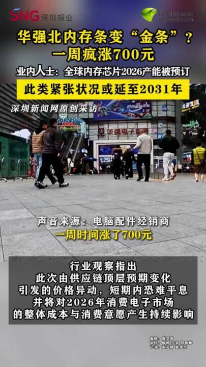 【华强北内存条变“金条”?一周疯涨700元】华强北内存条变“金条”?一周疯涨700元业内人士:全球内存芯片2026产能被预订此类紧张状况或延至2031年记者近日走访深圳华强北电子市场发现,内存及固态硬盘产品价格急剧上涨。一位电脑配件经销商表示:DDR5 32G内存条一周涨700元。该经销商坦言:“客户因内存和固态硬盘涨得太高都不想买,除非刚需才会入手。”据多位业内人士透露,当前